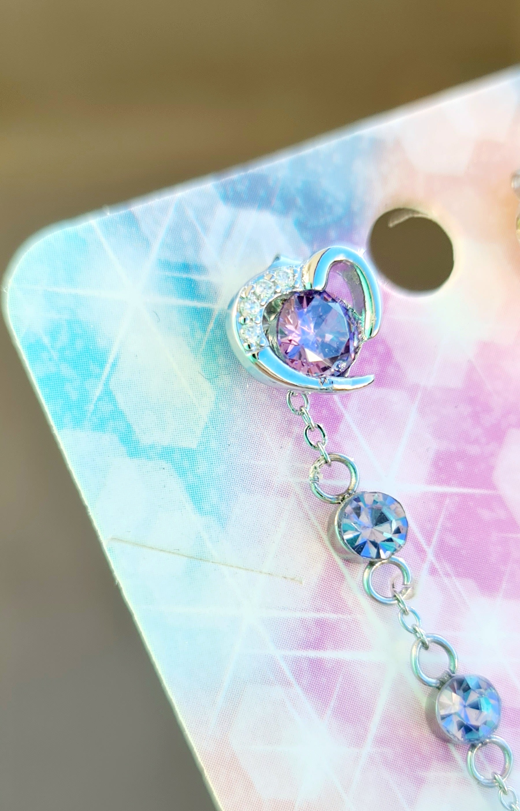 Eleganti orecchini pendenti con cuore e cristalli viola
