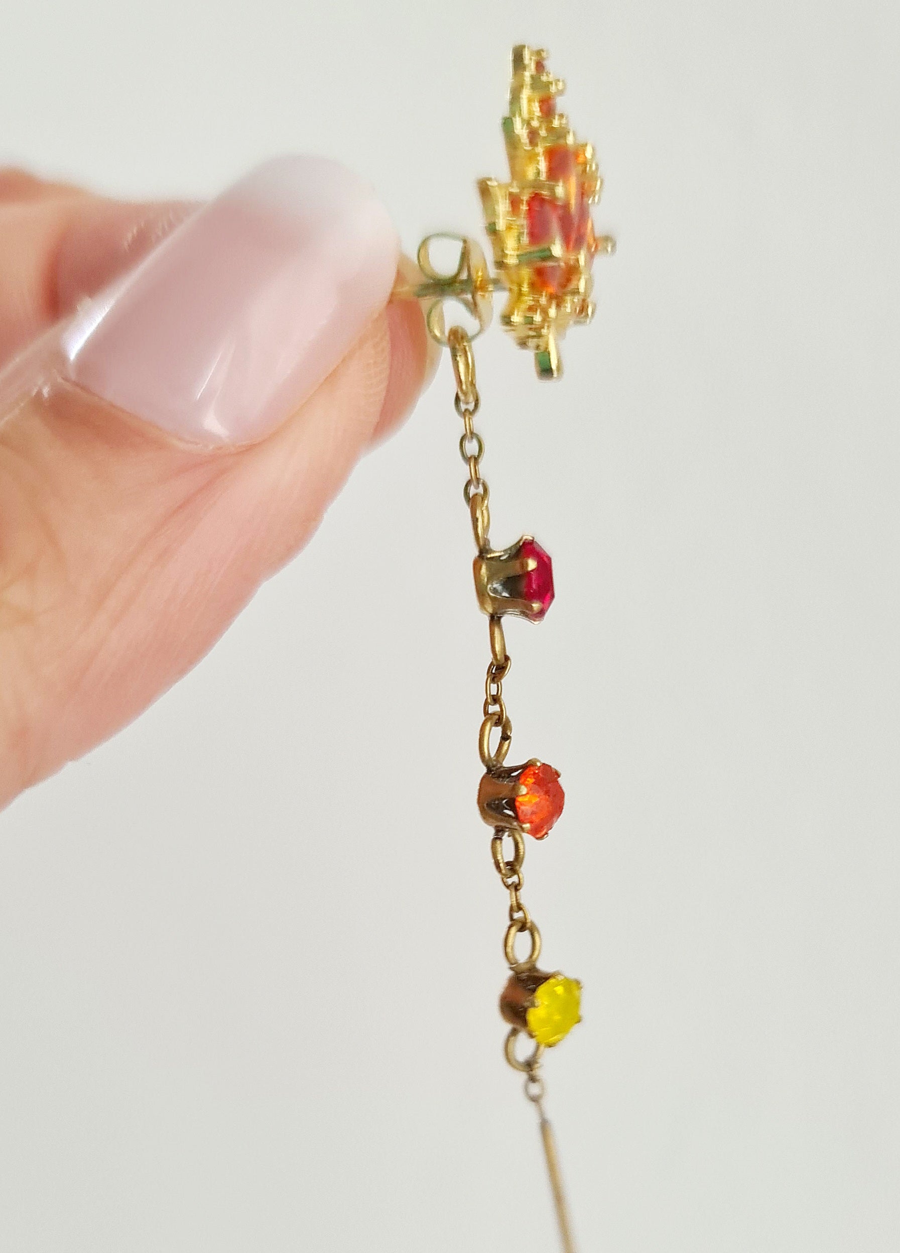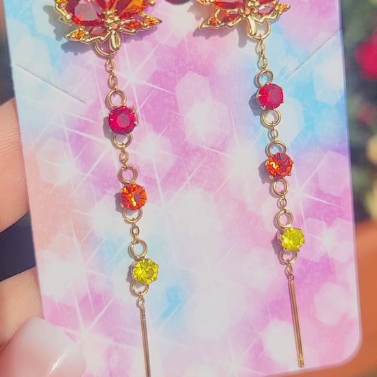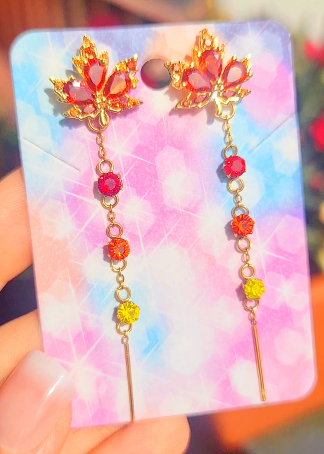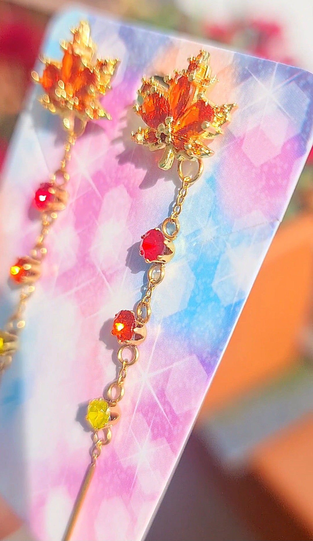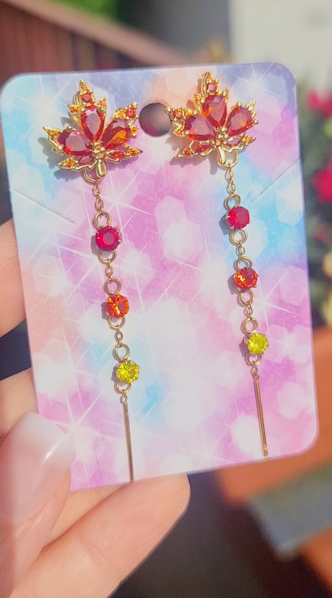 Eleganti orecchini in argento 925, pensati per la stagione autunnale. Il punto luce è a forma di foglia d'acero e la cascata di strass richiama proprio i colori caldi dell'autunno. Possono essere indossati in due modi: come semplice punto luce al lobo oppure con l'aggiunta della catena con 3 strass. Sono quindi molto versatili e possono essere adattati a diversi stili e occasioni.