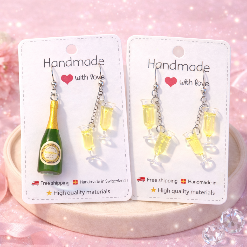 Brinda al tuo stile con questi orecchini unici a forma di calice di spumante, realizzati interamente a mano in Svizzera con cura artigianale e attenzione ai dettagli.