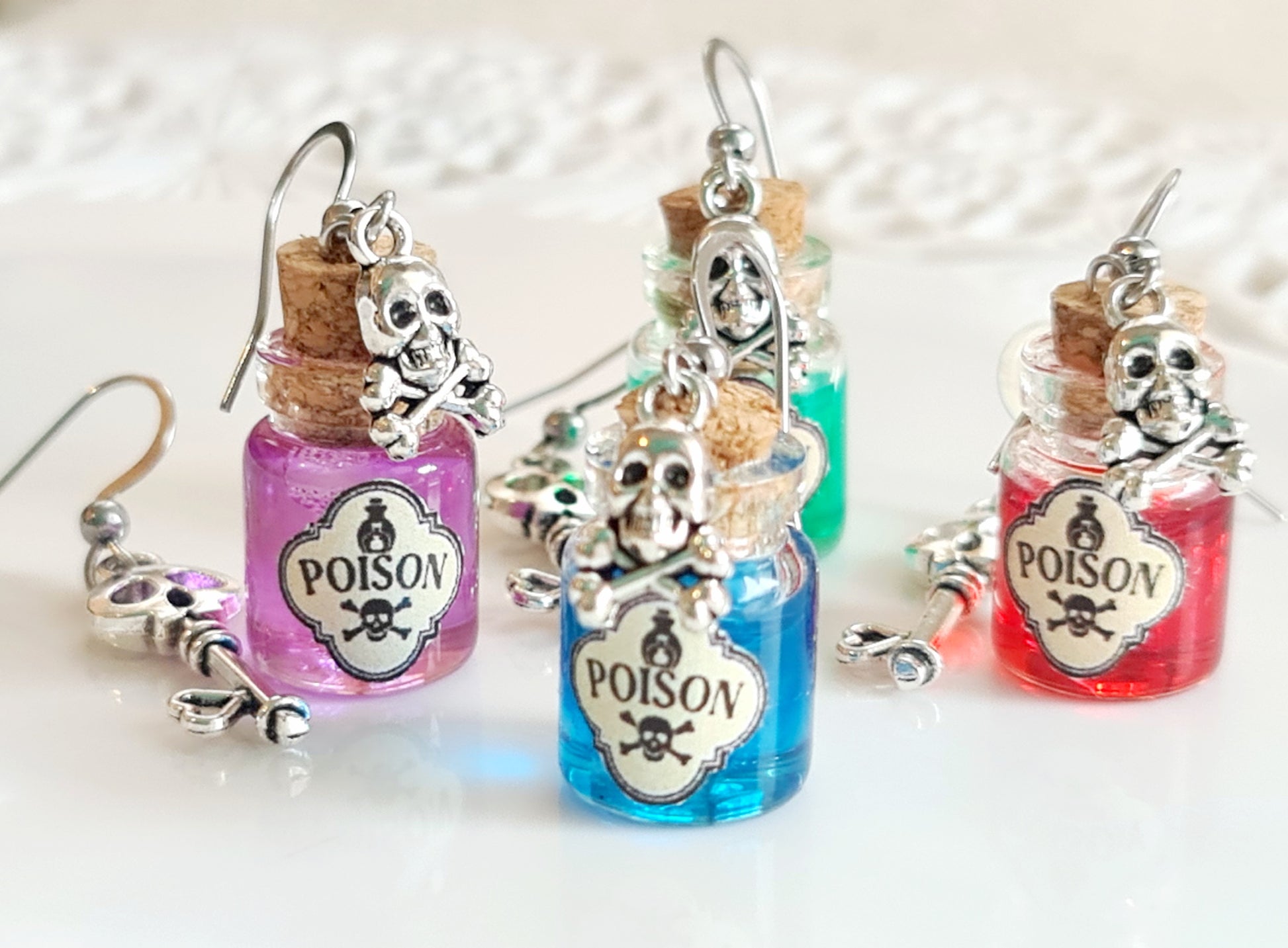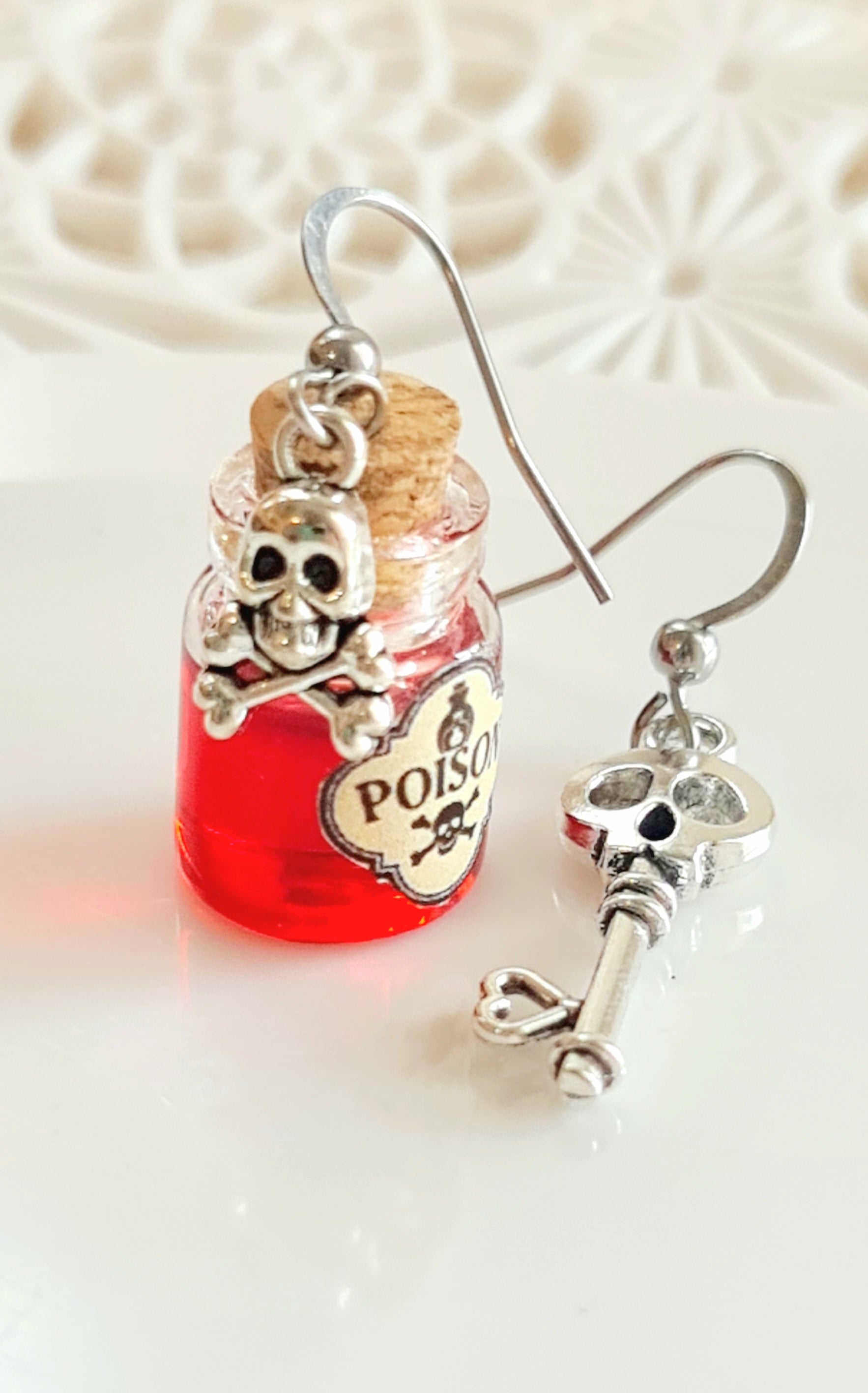 State cercando degli orecchini unici nel loro genere, che stupiscano i vostri amici la sera di Halloween? Questi orecchini con finte fiale di veleno sono un accessorio perfetto per Halloween o per carnevale. Li ho realizzati a mano con bottigliette di vetro, riempite di resina uv e decorate con un ciondolo a forma di teschio. Sono disponibili in vari colori e possono anche essere personalizzati: potete scegliere il colore che preferite e anche il ciondolo in metallo. Ganci in acciaio inox ipoallergenici.